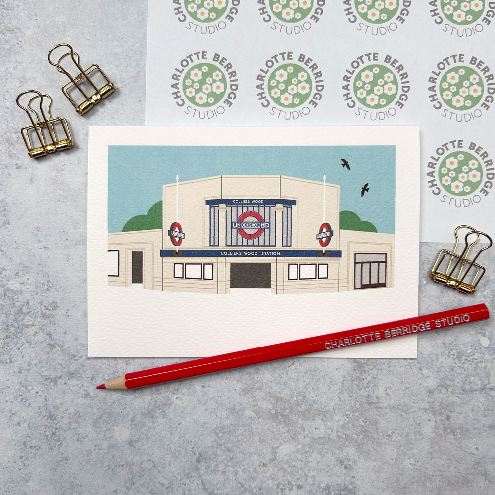 Illustrated card of Colliers Wood Station created exclusively by Charlotte Berridge.