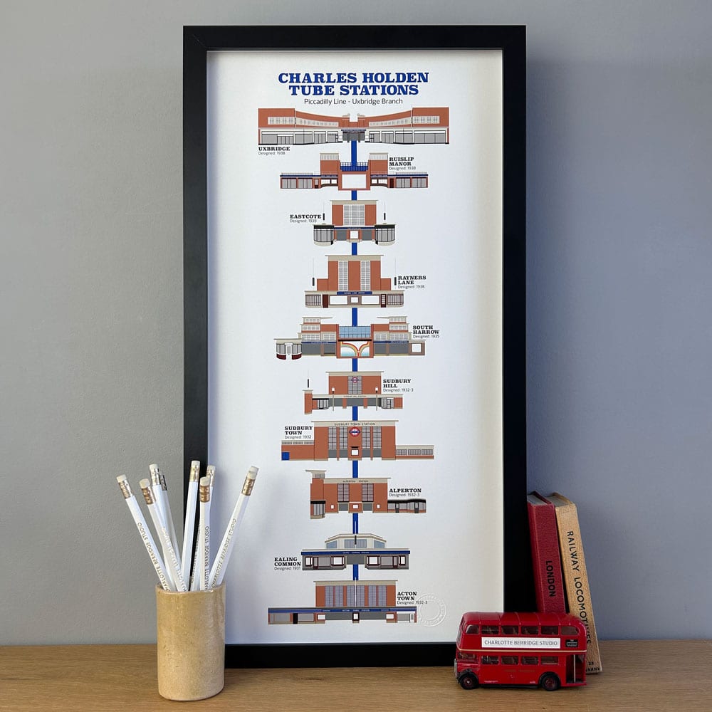 Stylised illustrated print featuring architect Charles Holden’s iconic Piccadilly Line – Uxbridge Branch tube stations created exclusively by Charlotte Berridge.