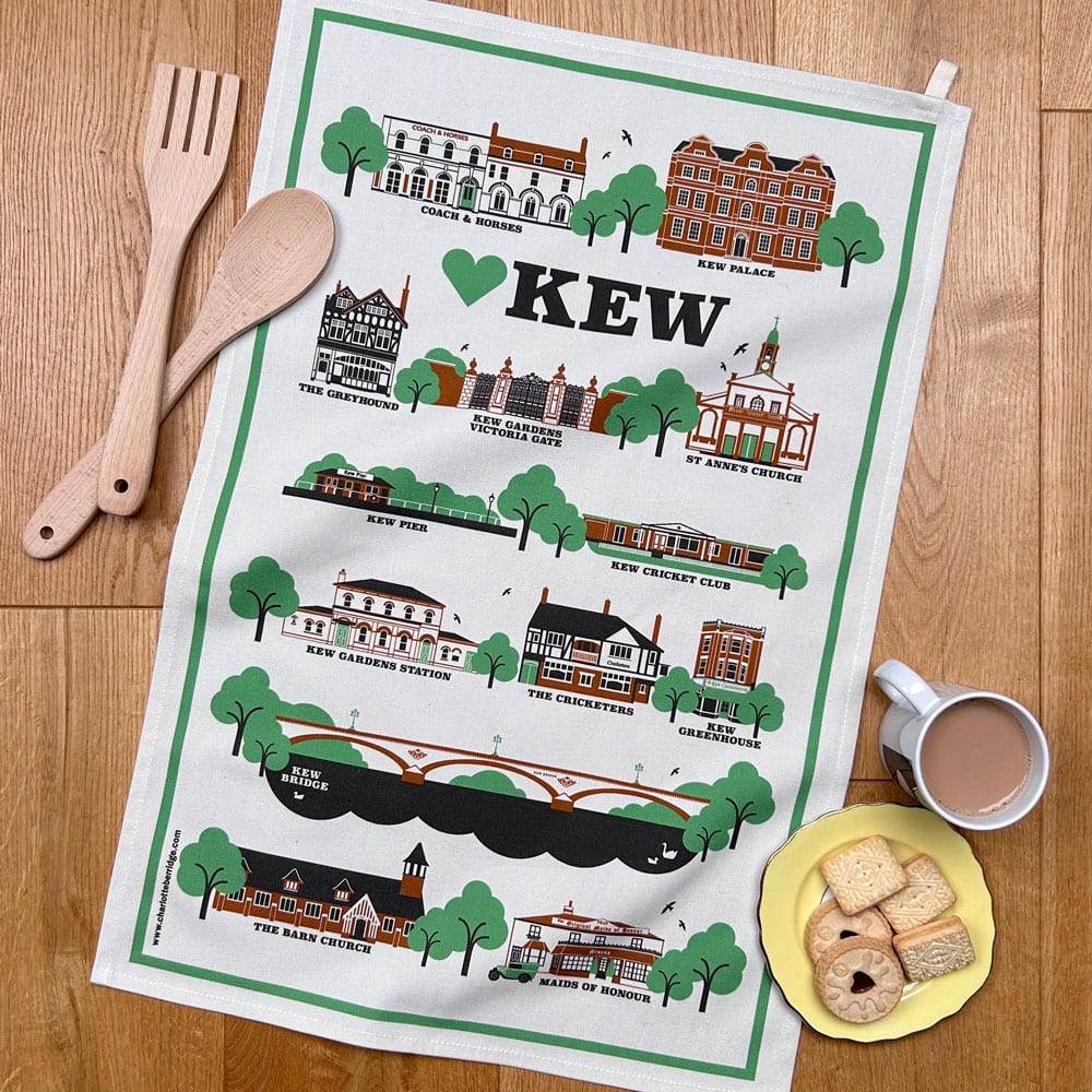 Illustrated tea towel, digitally printed on premium quality 100% unbleached organic cotton. The perfect gift for anyone who knows, loves, or lives in Kew.