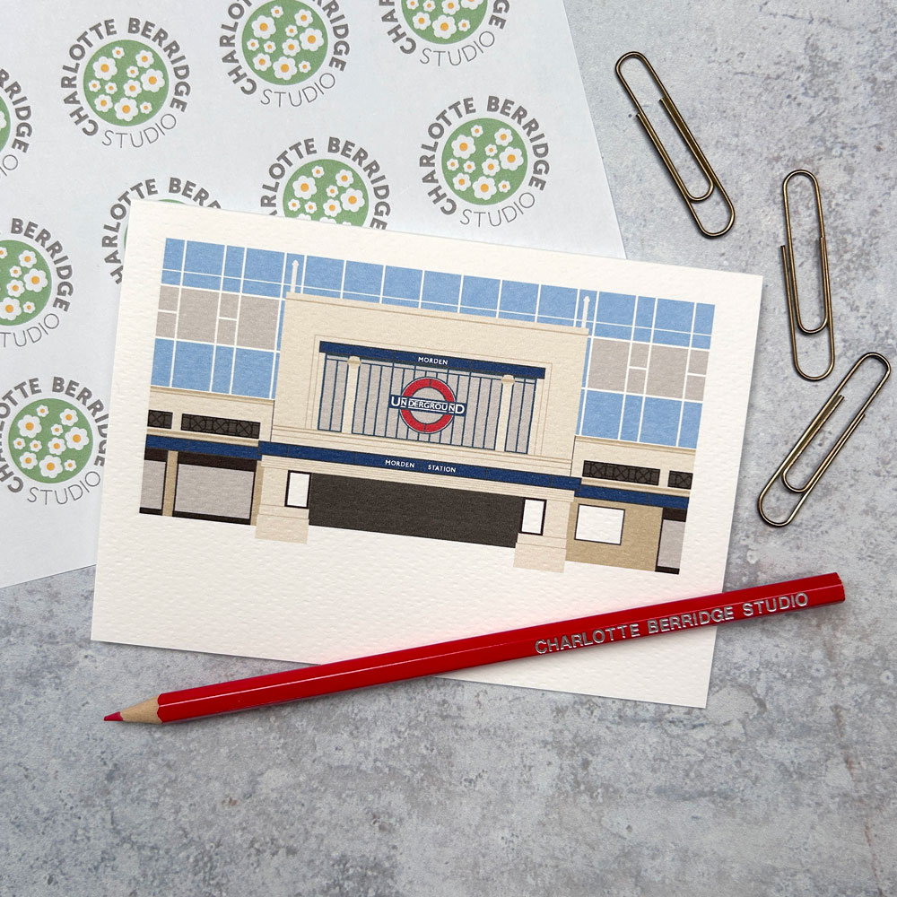 Illustrated card of Morden Station created exclusively by Charlotte Berridge.