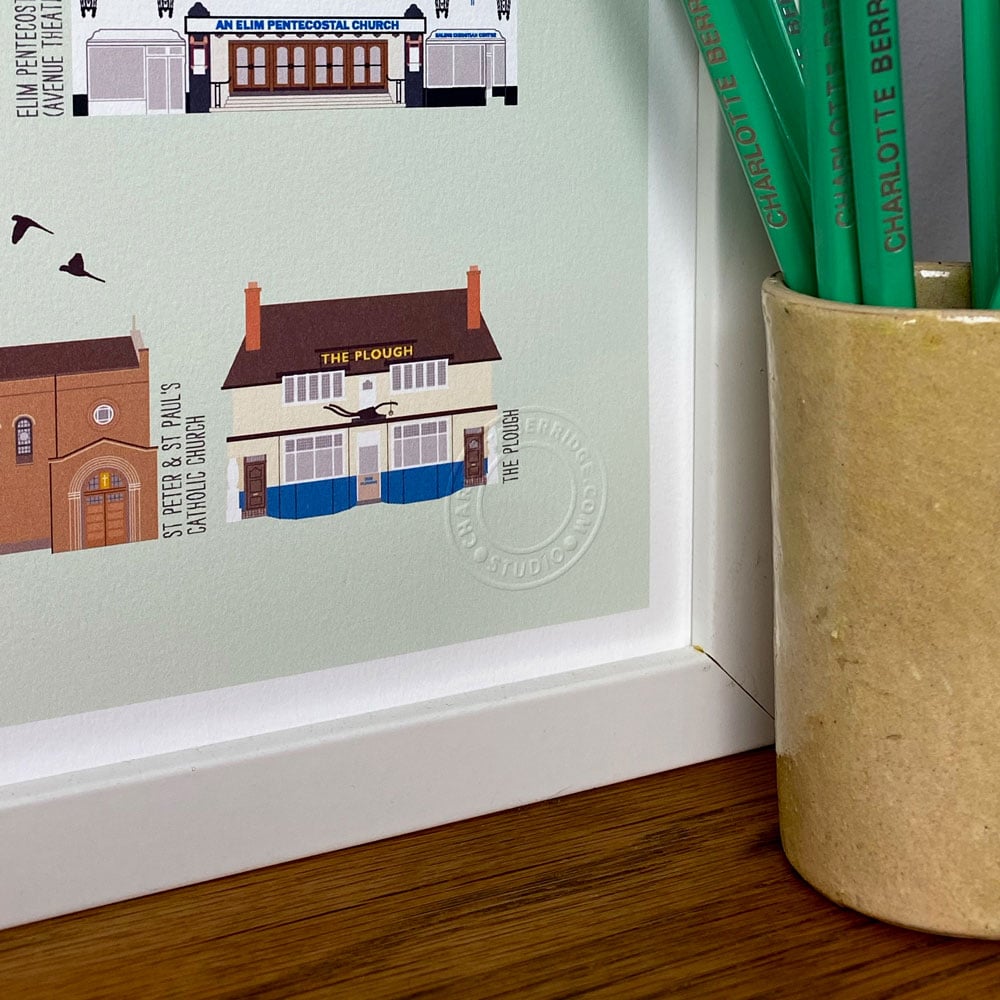 Illustrated art print of Northfields in Ealing created exclusively by local resident Charlotte Berridge. This print makes the perfect gift for anyone who knows, loves, or lives in Northfields.