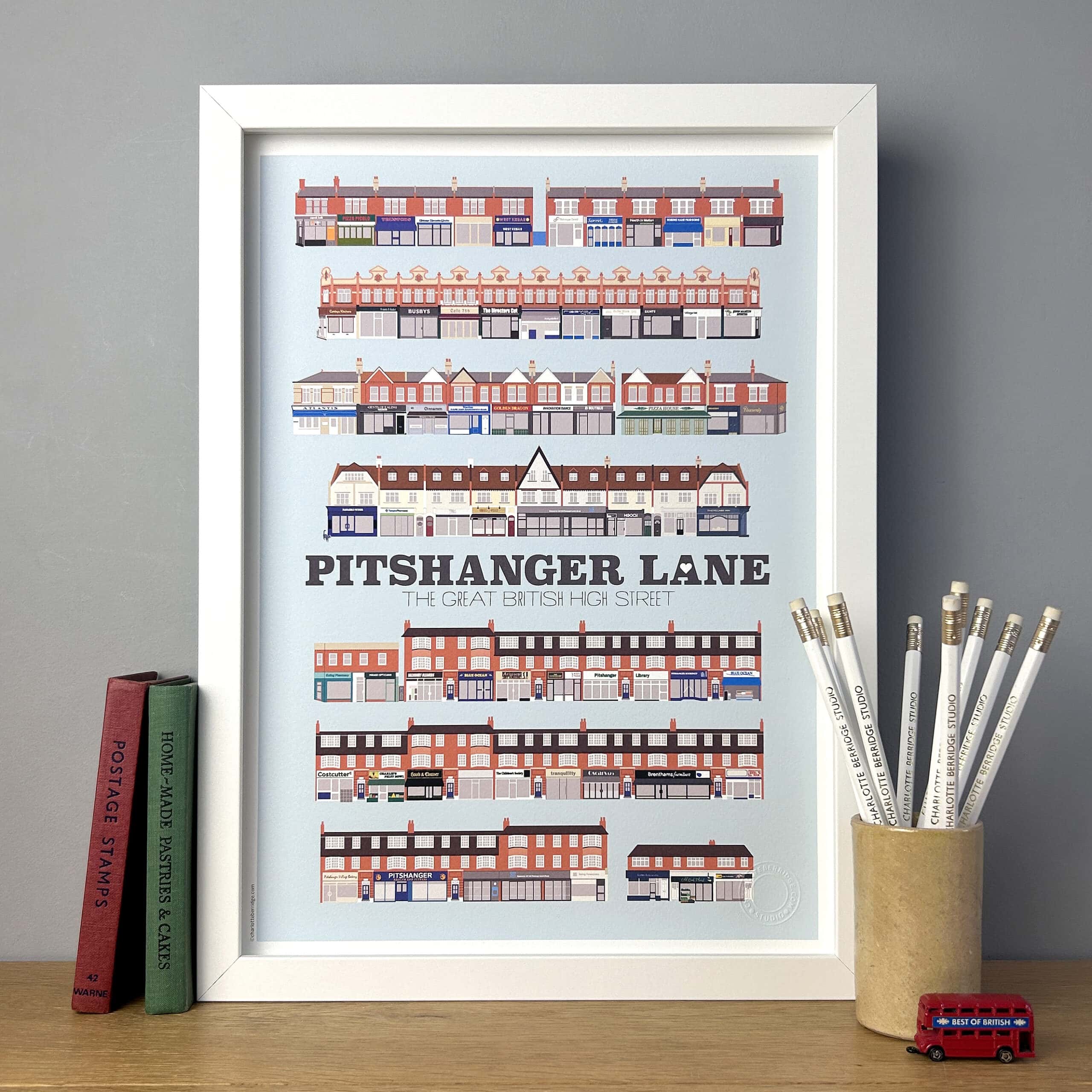Illustrated art print of Ealing’s Pitshanger Lane created exclusively by Charlotte Berridge. This local print makes the perfect gift for anyone who knows, loves, or lives in Ealing. Pitshanger Lane won the prestigious title of Great British High Street (London category 2015) and it’s an absolute gem! We’re all very proud of shopping local round here!