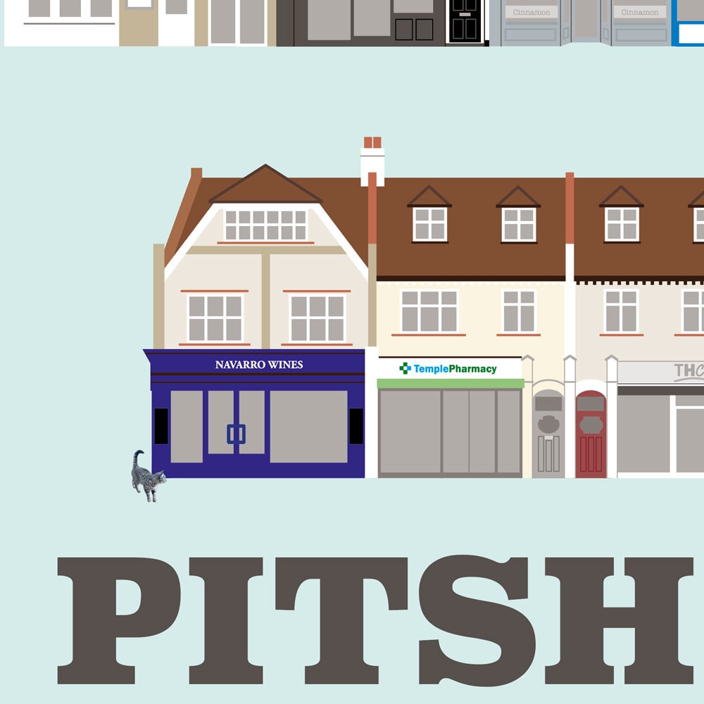 Every single shop on Pitshanger Lane in June 2023 and a tiny guest appearance from one of the celebrity cats (is it Jake or Fin?!) often seen visiting the area. The top of the print shows the north side, and the bottom, the south side of the Lane.