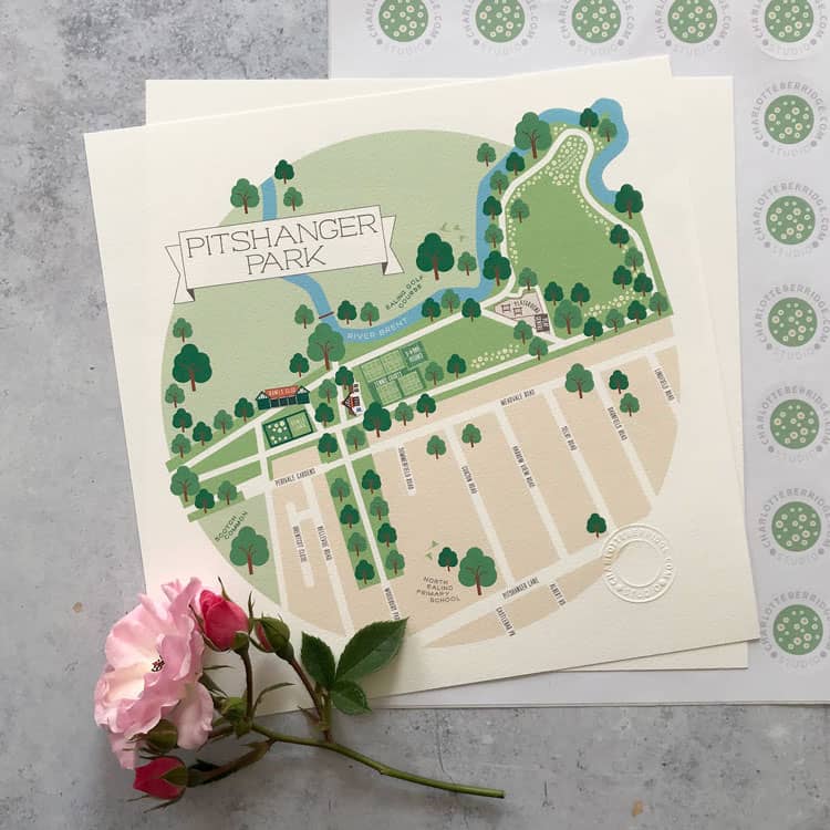 Illustrated map print of Pitshanger Park in Ealing created exclusively by Charlotte Berridge.