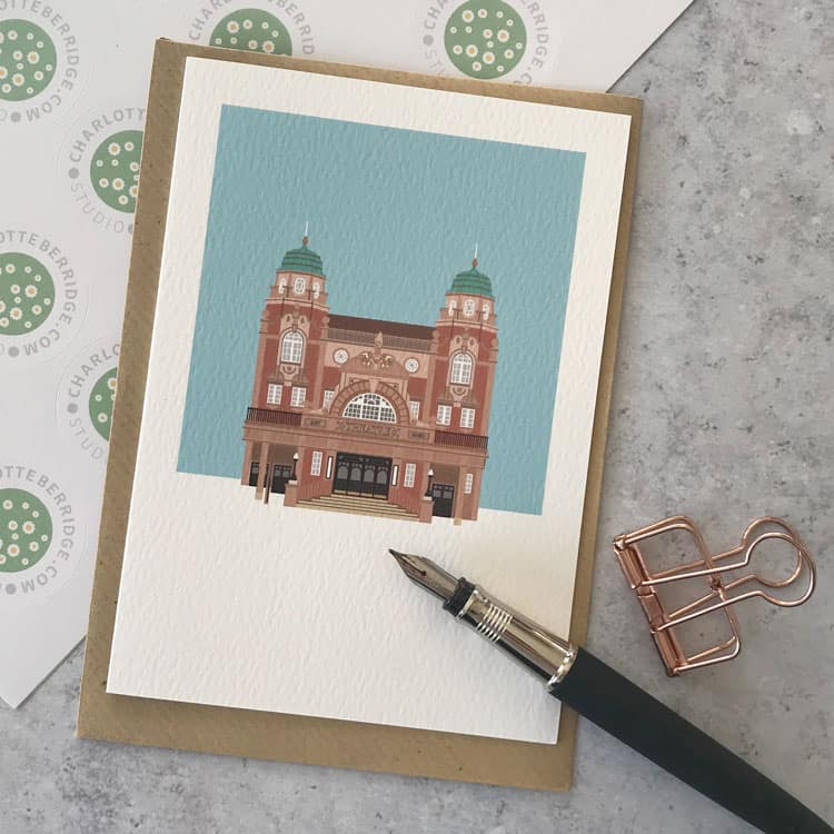 Set of five illustrated cards featuring historic Richmond landmarks created exclusively by Charlotte Berridge. Each pack is carefully hand packaged in a glassine bag, which is 100% recyclable and biodegradable. All my cards are printed on 300gsm recycled card, supplied with a recycled envelope. Each folded card measures approx 105mm wide x 148mm tall.